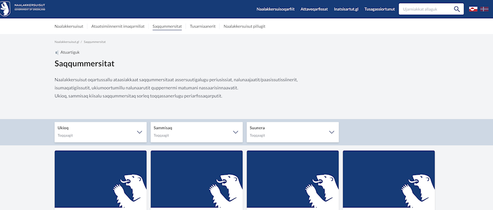 På den nye naalakkersuisut.gl, kan du under publikationer, høringer og mødereferater filtrere på et indhold ved at bl.a. vælge: