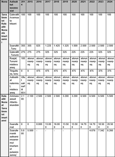 Tabelimi atuarneqarsinnaapput 2024-mut pisassiissutit paarlaassutigineqartut aamma ukiup siuliani pisassiissutigineqartut tonsinngorlugit: