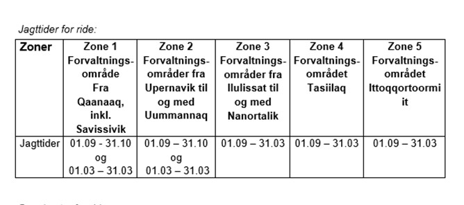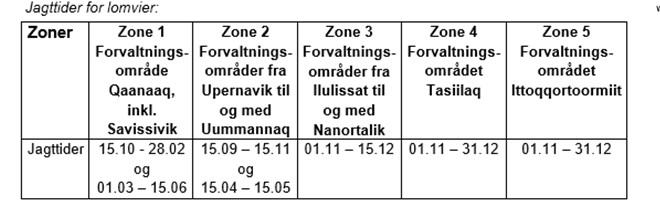 Departementet for Fiskeri, Fangst, Landbrug og Selvforsyning skal hermed erindre om de gældende jagttider, dagskvoter og gældende regler for lomvier, jf. Selvstyrets bekendtgørelse nr. 22 af 30. maj 2023 om beskyttelse og fangst af fugle. Det erindres jagten på rider i zone 1 og 2 er stoppet pr. 31. oktober.