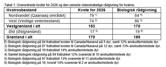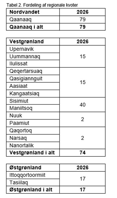 Den samlede kvote for hvalros i 2026 er uændret i forhold til 2025. Fordelingen af kvoterne på de enkelte bestande ser således ud: