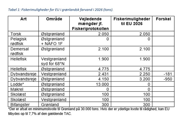 Fiskerimulighederne for 2026 blev fastsat med udgangspunkt i de vejledende mængder i Fiskeriprotokollen. På grund af nedgang i den videnskabelige rådgivning, er fiskerimulighederne for rejer i både Vest- og Østgrønland blevet reduceret med hhv. 181 og 950 tons. På grund af den nye minimumsgrænse for lodde på 30.000 tons til Grønland, er EU ikke blevet tilbudt kvote på lodde i 2026. Derudover, har Grønland også indført en begrænsning i antallet af udenlandske fartøjer der kan fiske på rejebestanden i Østgrønland. Fiskermulighederne kan ses i Tabel 1.