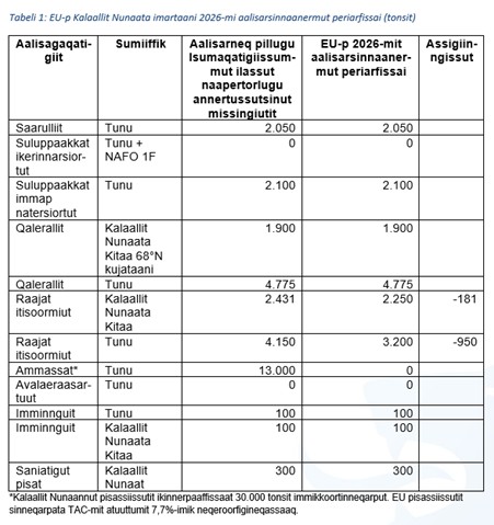 Isumaqatigiissummi EU-p Kalaallit Nunaata imartaani 2026-mi aalisarnissaanut tunngaviliisoqarpoq. Isumaqatigiissut Aalisarneq pillugu Isumaqatigiissummut 2025-imit 2030-mut Ilassut Kalaallit Nunaata aamma EU.p akornanni Aalisarnermi Peqatigiinneq pillugu Isumaqatigiissutip ilagisaa tunngaviusoq. Aalisarneq pillugu Isumaqatigiissummi ilassummi EU Kalaallit Nunaata imartaani Kalaallit Nunaata aningaasatigut taarsiivinissaaq taarsiullugu pisassiissutinik arlalinnik neqeroorfigineqarpoq.