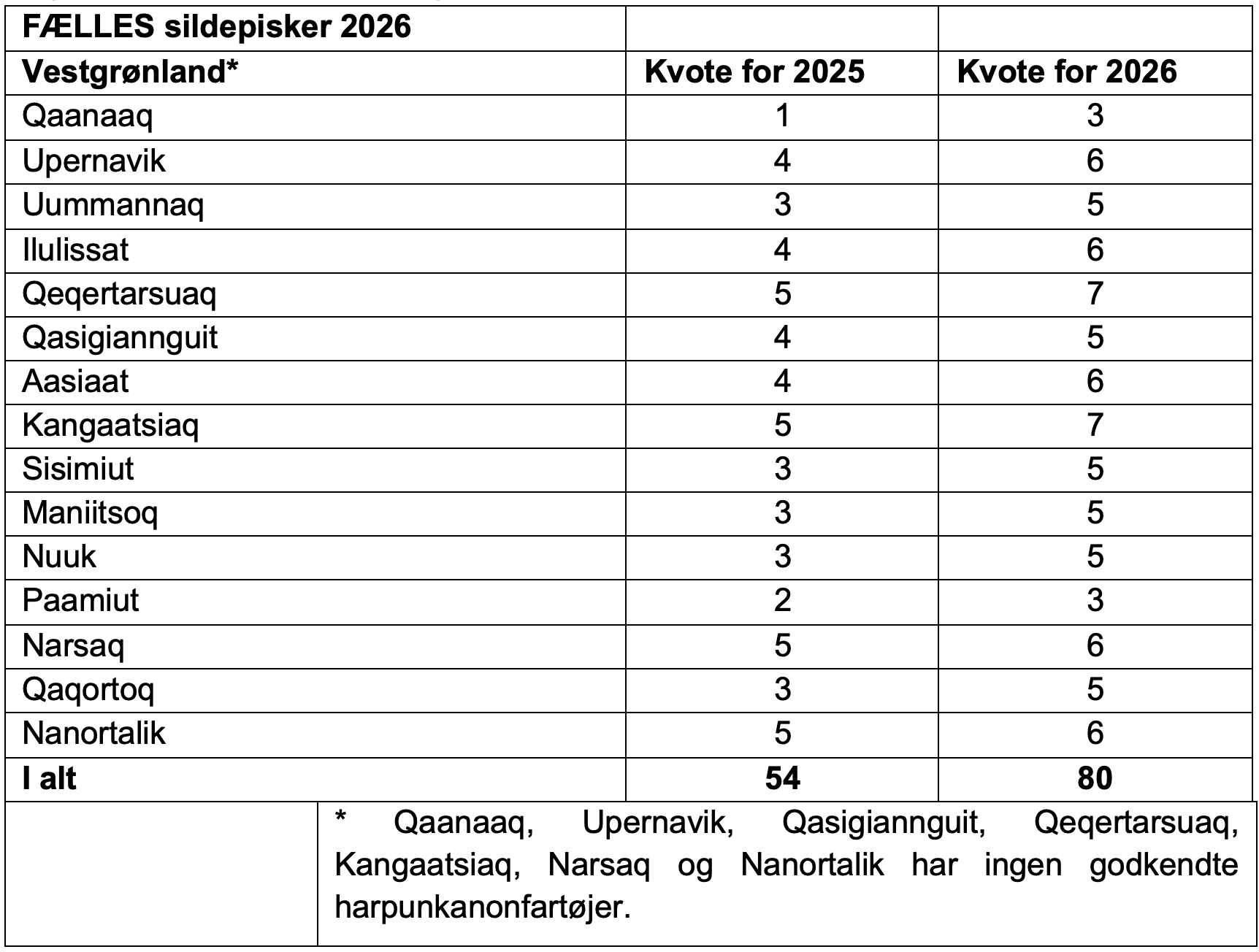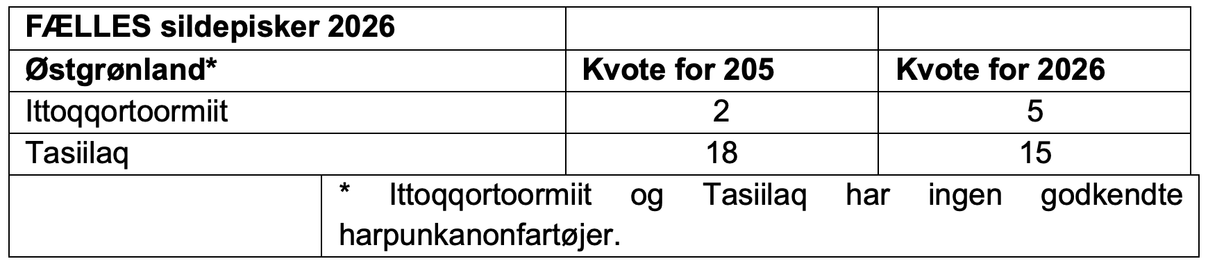 Den årlige grundkvote for Østgrønland for 2026 er på 20 dyr. Deltagere i fællesfangst med teknisk godkendelse til sildepiskerfangst jvf. betingelser i nedenstående bekendtgørelser kan fange i perioden 1. januar – 31. december.