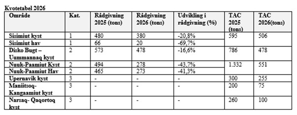 Naalakkersuisut har den 18. december fastsat TAC for krabber i Vestgrønlandsk farvand, det havgående fiskeri efter hellefisk i Vestgrønland, samt kammuslinger for 2026. TAC’erne for 2026 kan forefindes her: Naalakkersuisut.gl
