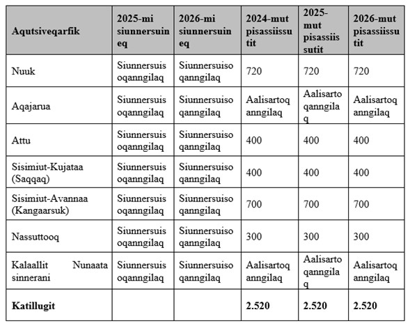 Aqutsinissamik pilersaarummi malittarisassat tunngavigalugit aamma Aalisarneq pillugu Siunnersuisoqatigiinnut tusarniaareernermi 2026-mut saattuartassat tamarmiusut tullinnguuttumisut aalajangersarnerat inissinneqarput: